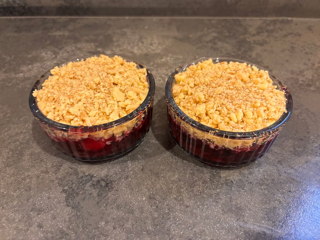 There were already signs that things were warming up slightly, with some of the snow having disappeared. The ducks were also keeping some parts of the canal ice-free. This afternoon we’ve had rain rather than snow, which has accelerated the process; the bank is more green than white, and the pontoons are returning to concrete. To while away the afternoon, I made a couple of individual apple and blueberry crumbles, with fruit that needed using up.