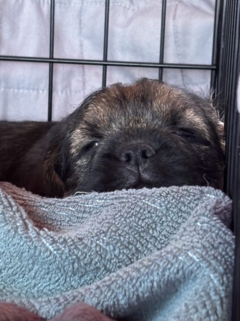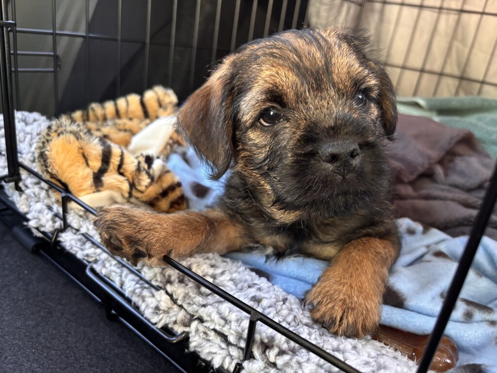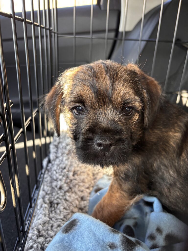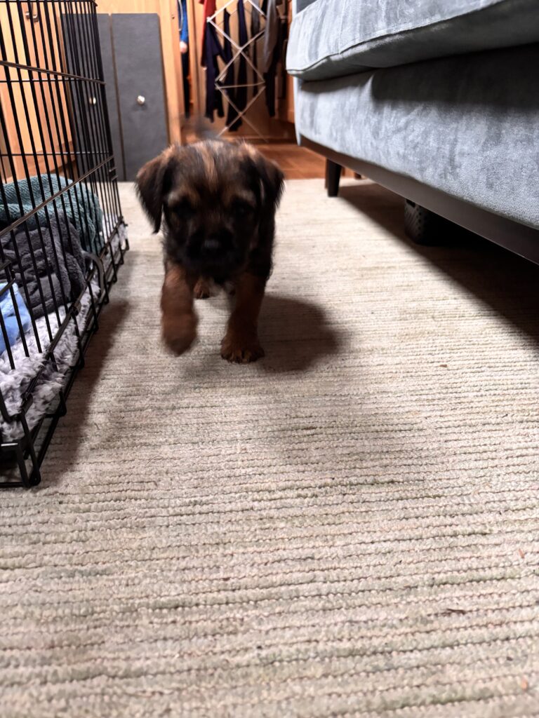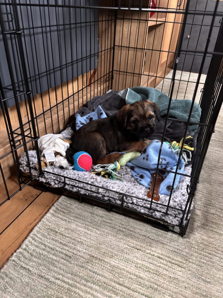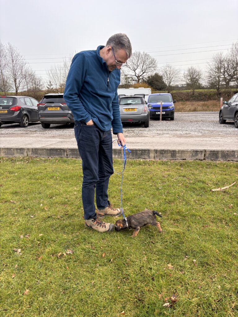 Today we went to collect Macc, our new Border Terrier puppy. We’d driven down to Essex yesterday,min horrendous rain and spray, and stayed overnight in a hotel. We were at the breeder’s house at 9.30 — Macc was the first to leave the litter. Adrian did all the paperwork, then it was time for Macc to say goodbye to mum, Poppy, and the breeder, Anne and her husband.