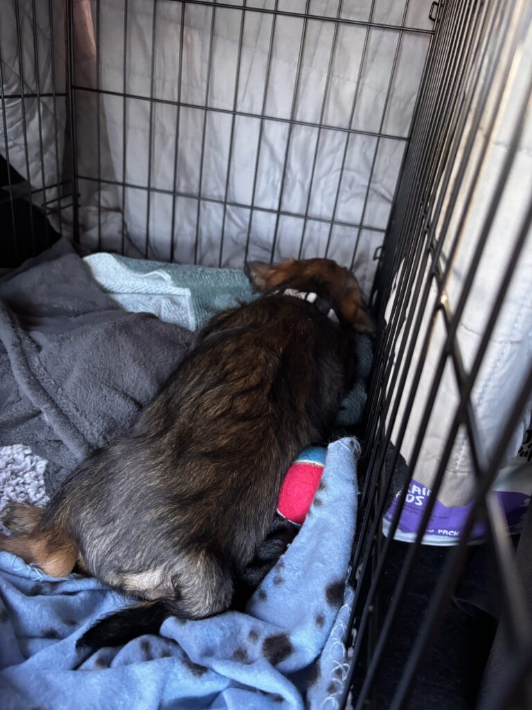 At the boat, Adrian took him for a walk on the grass while I moved his crate from the car to the boat. Once he came inside, he spent a while exploring; he’s also had some food and water, had a nice game of tug with some of his new toys, and then took himself into his crate, rearranged the blankets, and settled down for a rest.