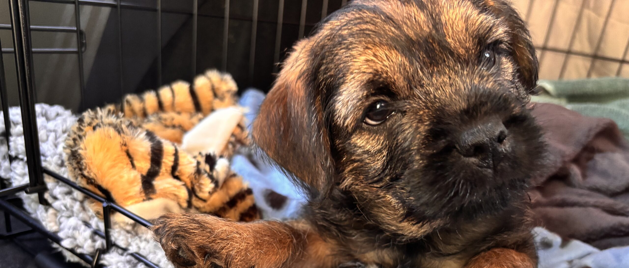 Today we went to collect Macc, our new Border Terrier puppy. We’d driven down to Essex yesterday,min horrendous rain and spray, and stayed overnight in a hotel. We were at the breeder’s house at 9.30 — Macc was the first to leave the litter. Adrian did all the paperwork, then it was time for Macc to say goodbye to mum, Poppy, and the breeder, Anne and her husband.
