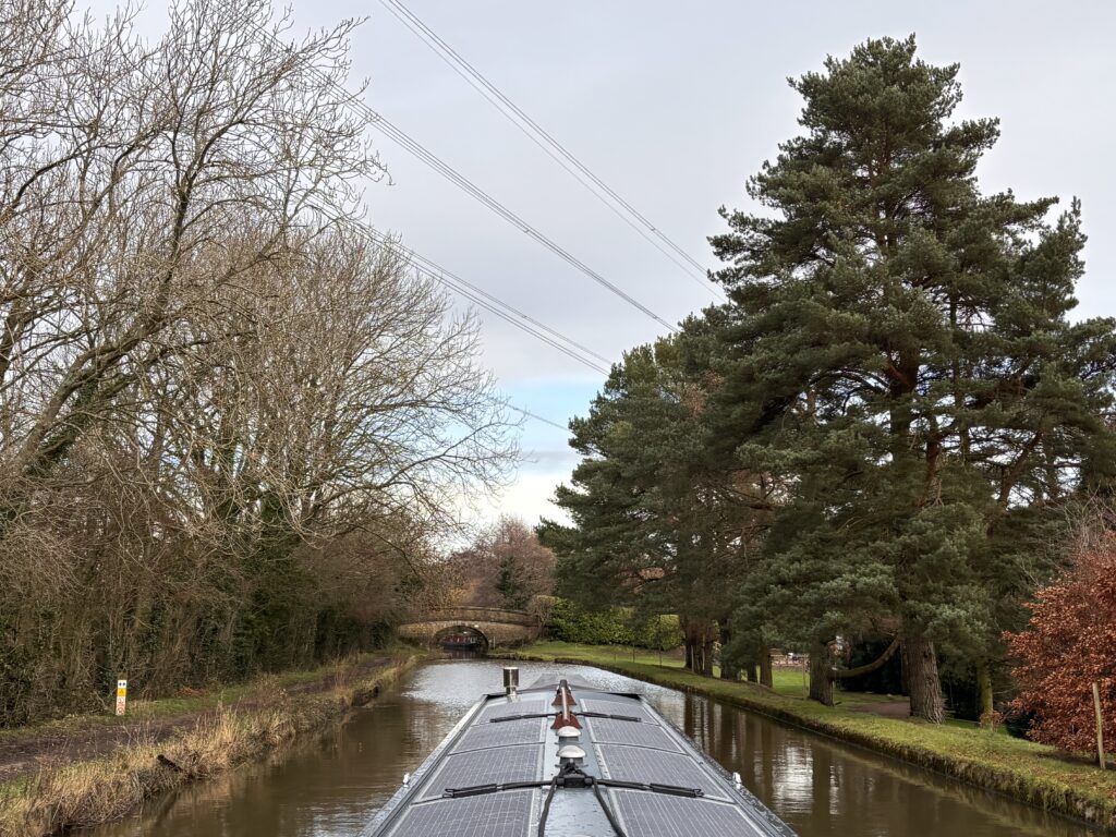 Mark was on the towpath taking photos, making the most of the bits of blue sky. We turned at the winding hole about half a mile away and headed back. Mark jumped on at a bridge hole and had a go at steering, to see how the boat handled. Even though there wasn’t a great deal of sunshine (and it’s December so the sun is low) around half the power we used while under way came from the solar. Then I did the turn into the tight marina entrance; as I did so, I seemed to pick something up on the prop, and once I was inside and in reverse, a bit piece of plastic floated away. We came into the berth facing forward this time, which means that while the hosepipe will now reach, the power cable has to run along the roof.