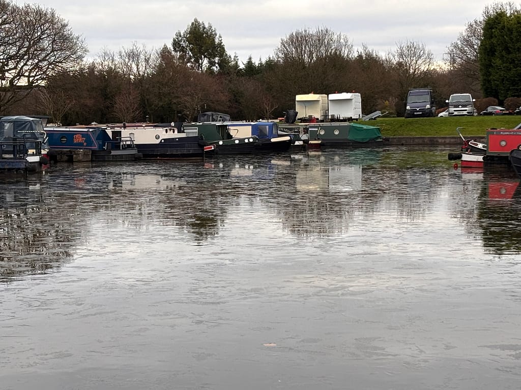 We stopped in Poynton on the way back so Adrian could pick up an order from the Waitrose there. Back at the marina, there was ice floating on the water, so it had clearly been frozen earlier.