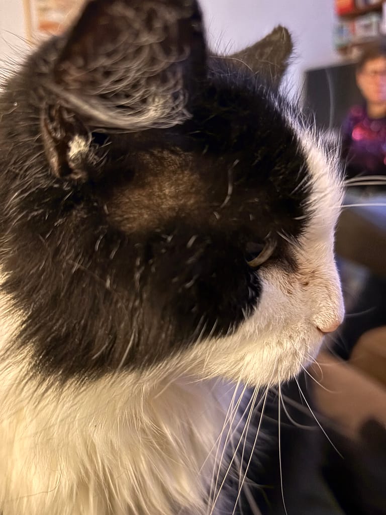 We’ve been down south seeing Adrian’s family for a few days, which has been lovely. We stayed with his aunt and uncle in Kent, and saw his cousin and her family. One of the cats likes to get as close as possible to your face.