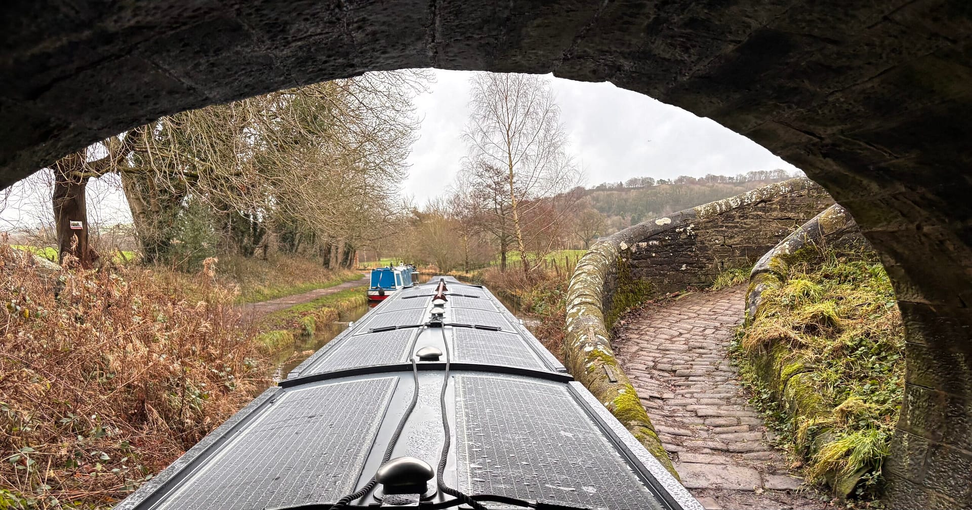 We knew KofR had been moored on the aqueduct by Clarence Mill (because we passed them the other day) so decided that rather than stopping where we’d been a few days ago, we’d carry on and see if their space was still available. I switched back to electric propulsion as we went past Kerridge Dry Dock and then squeezed through all the boats at Bollington Wharf.