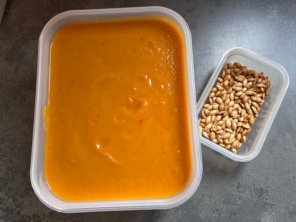 We have visitors tomorrow so in Macc’s sleeping sessions I’ve been flat out. I made stock from last night’s roast chicken carcass (Adrian, who is the stock king had actually put all the ingredients in the pan, I just added water and turned it on), then made a batch of oat and raising cookies, half of which were baked and half of which have gone in the freezer. Then this afternoon I’ve made a big pot of spicy roasted butternut squash soup, and I’ve even roasted the seeds.