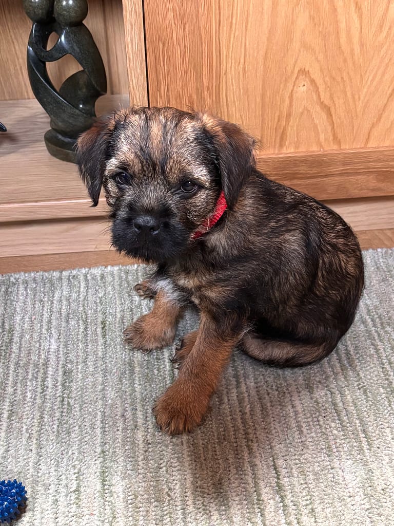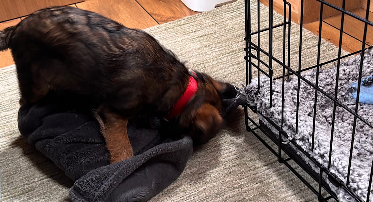 Adrian went to a conference in Manchester today, so we were both up a bit earlier than normal as he needed to leave for Poynton Station just before 8am. After yesterday’s trials with Macc, today has been much better. We’re in the difficult phase where he needs to work out that he’s not in charge, and we need to make sure we’re not letting him develop bad habits. During one of his mad moment today, he decided his blanket needed to be pulled out of the crate, although to his credit he did put it back again (mostly) a bit later. We’ve been alternating play and sleep, but even when he’s enjoying himself he sometimes seems to have a grumpy face!