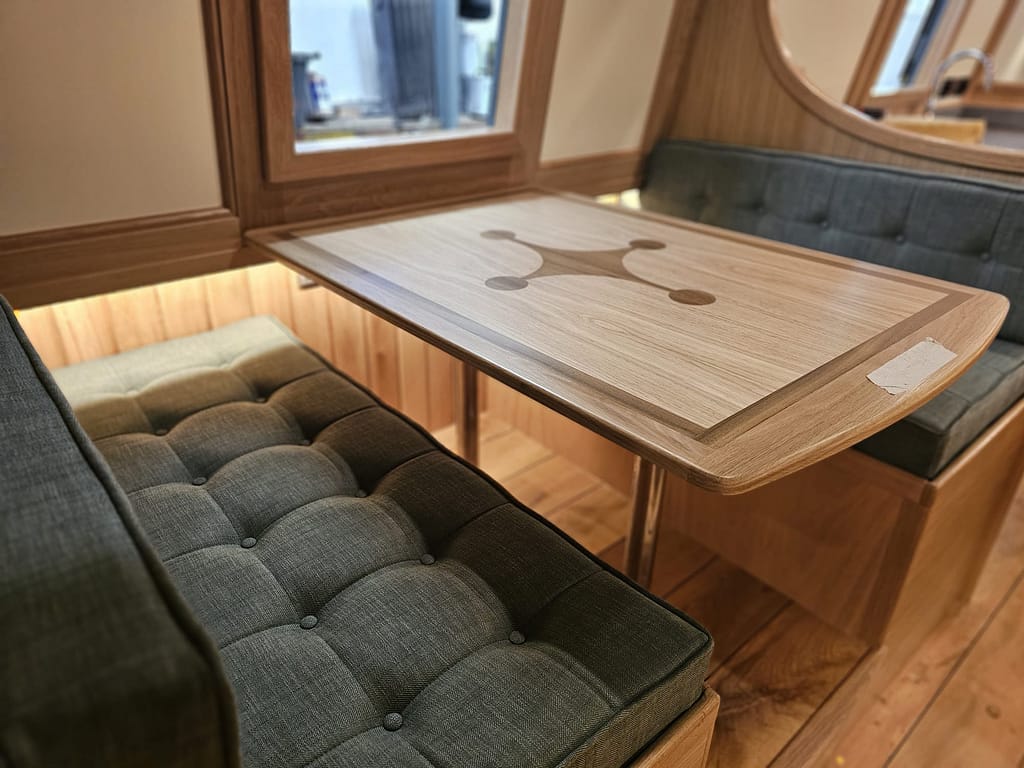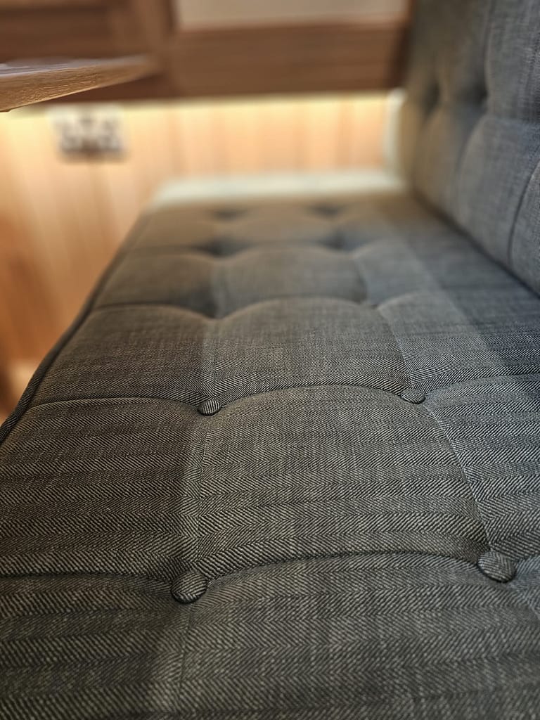 What will probably be the final set of photos from Braidbar have arrived, and things are really coming together. The dinette cushions and upholstery arrived today, and look great. The photos don’t really show how green the fabric is; even so, we’re thinking it might turn out to be even nice than what we’d originally chosen!