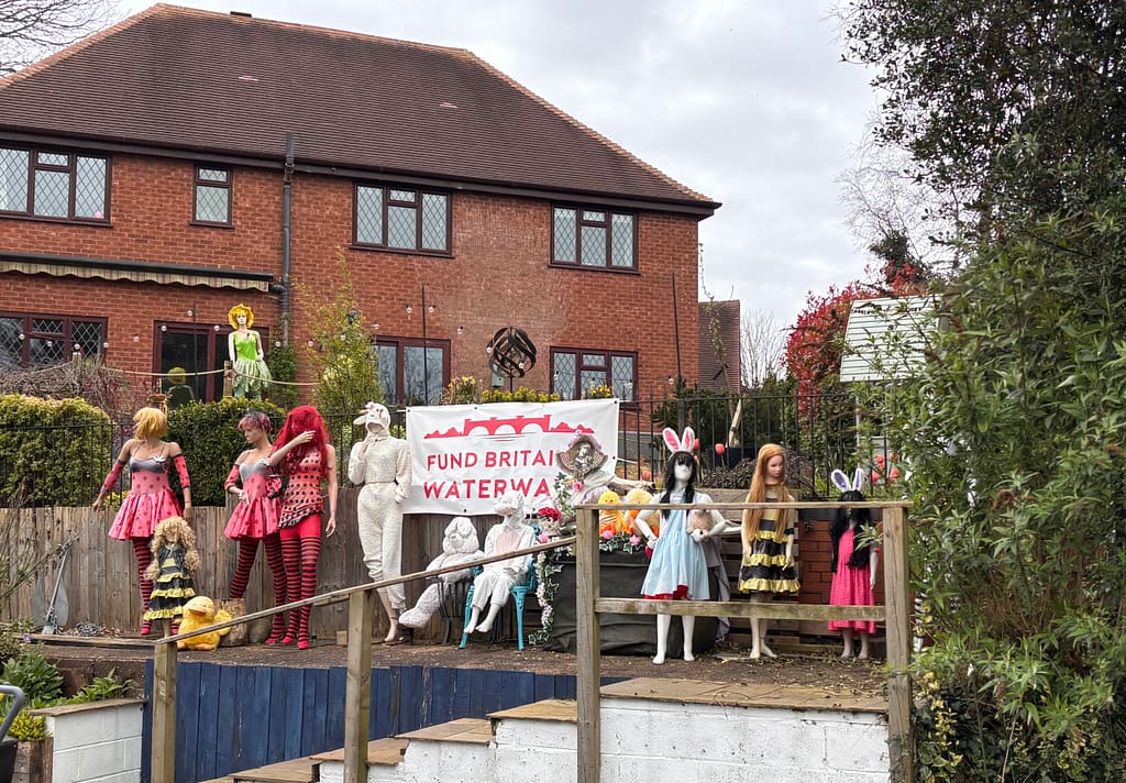 By the right-angle bend at the end of the aqueduct there are some houses up on the hill with gardens down at canal level. Then a bit further on is the one with all the mannequins in the garden, this time with an Easter theme going on.