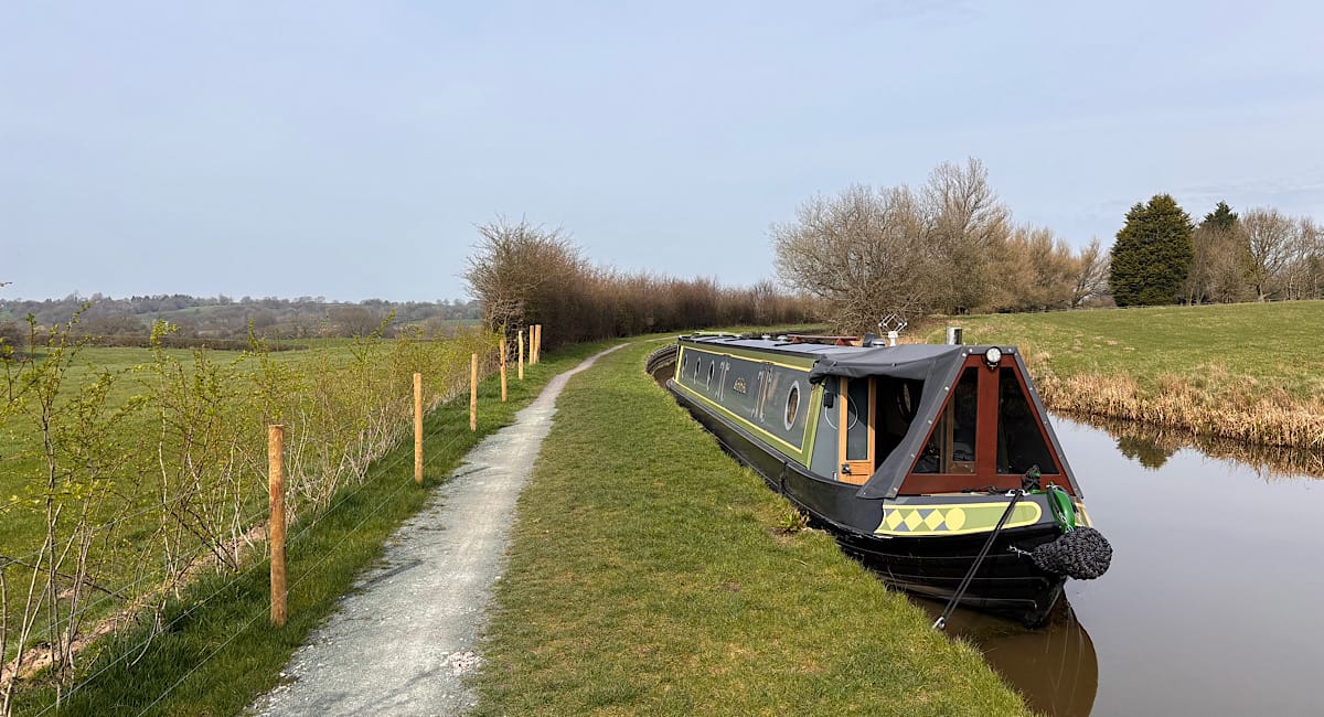 We wanted to moor not too far from the top of Bosley Locks, but the maps suggest there aren’t any official visitor moorings, just long term ones. So when we came through Bridge 52 and saw both piling and a section with a newly planted hedge so we could have a view both sides, we pulled up and moored.