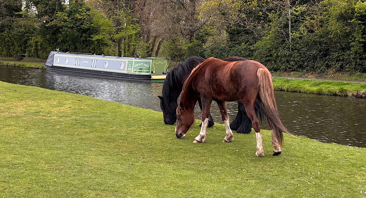 In the middle of the morning, Adrian wanted to go for a walk so I stayed behind with Macc. He walked back to the junction and across the playing fields and found some more shops including a Sainsbury’s local. They’re in the Wordsley Green area of Stourbridge rather than the town centre. I wrote an article and did some chores. As I did the washing up, I mused on the fact that the other day we were moored next to the workings of the new Midland Metro extension, and just a couple of days later have a view of a publicly accessible field where horses roam freely.
