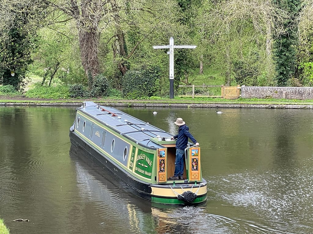 It had rained overnight but was dry this morning when we set off at about 8.45 with Macc already having his post-breakfast nap in his crate. The journey of a mile or so to the Stourton Locks was not without interest, as we had to pass an oncoming boat and ended up on the bottom, even though we were about 4ft from the bank. Adrian opted to work the locks, and the top one was KV’s one-hundredth lock.