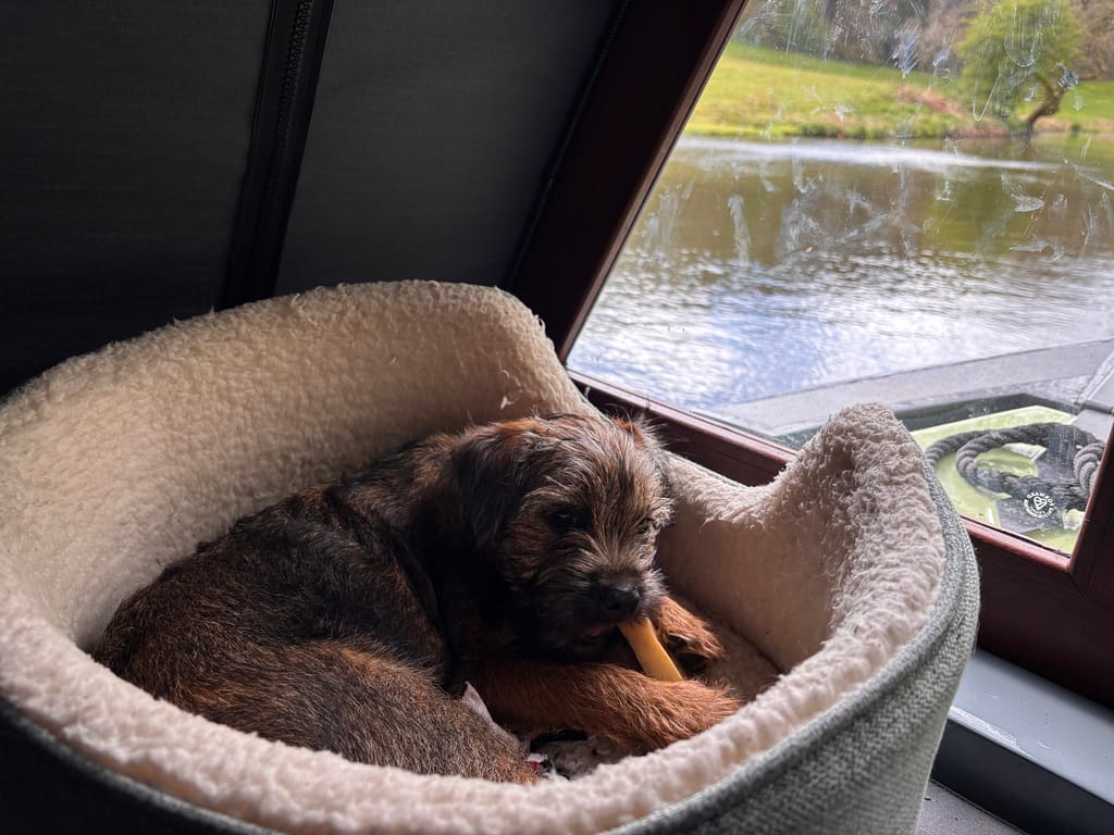 The sun came out briefly, and we took Macc for a walk little walk down to the lock which is only a few hundred yards in front of us. When we got back, he settled in his bed in the well deck, chewing a cheese stick and looking out of the window.