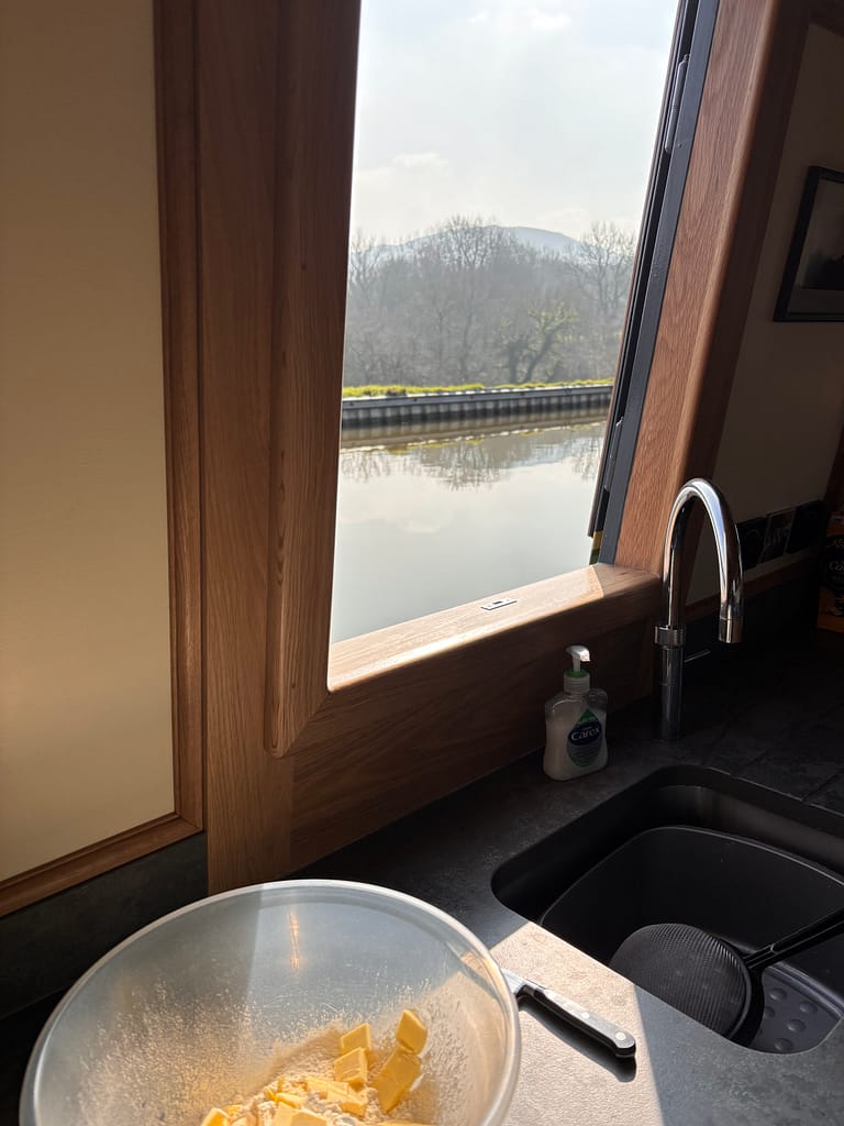 After lunch, I’d been wondering what to do with last night’s leftovers, so thought I’d turn them into a flan. That required a flan case, so I made some pastry. I had the galley side doors open, with the view of The Cloud across the water.