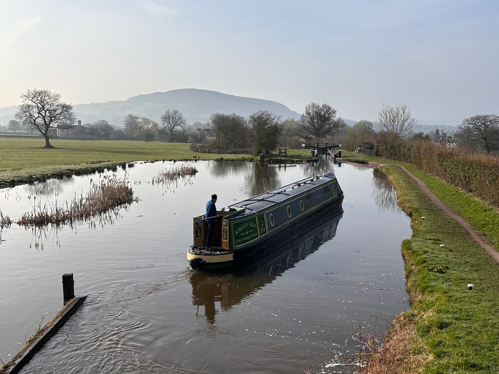 It really was glorious, and the lapwings in the field next to us were doing their looping flight. Our plan had been to get water above the flight, then head down Bosley Locks, hoping that by that time Macc would be asleep. But all this walking seems to be really tiring and he was already asleep — so we decided to set off, go down, and get water on the way to Congleton tomorrow. So it was before 8.30 that we left our mooring; very shortly afterwards a boat appeared behind us and were probably really frustrated to find us in front of them! I jumped off at the bridge and went down to the top lock, where I found a single-handed chap just leaving the lock. He said he had a mate turning up at 9.30 to help him, so he’d wait on the landing for the next lock and have a coffee and a bacon sandwich — and would set the lock for us. So I refilled the top lock and KV entered her first chamber at 8.43.