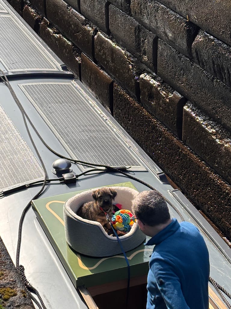 Adrian was keeping an eye on Macc via the webcam, so we knew when he’d woken up. At first he seemed content just to stay there, but then started complaining so in Lock 9 I went in to get him out for a wee. He was terrified of the sound of the paddles being wound up though, so went back on the boat — this time at the stern with Adrian. He started in his bed in the engine room, but was far happier with it on the rear slide where he could see what was going on.