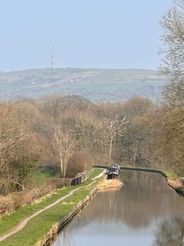 Just ahead the canal goes over a very high aqueduct over the river Dane, and beyond is an impressive railway viaduct. We have the occasional noise of the trains, but there’s no road anywhere near. We took Macc for a towpath walk, and looking back we realised the BT tower that you can see from large parts of the north west is on the hill behind us.