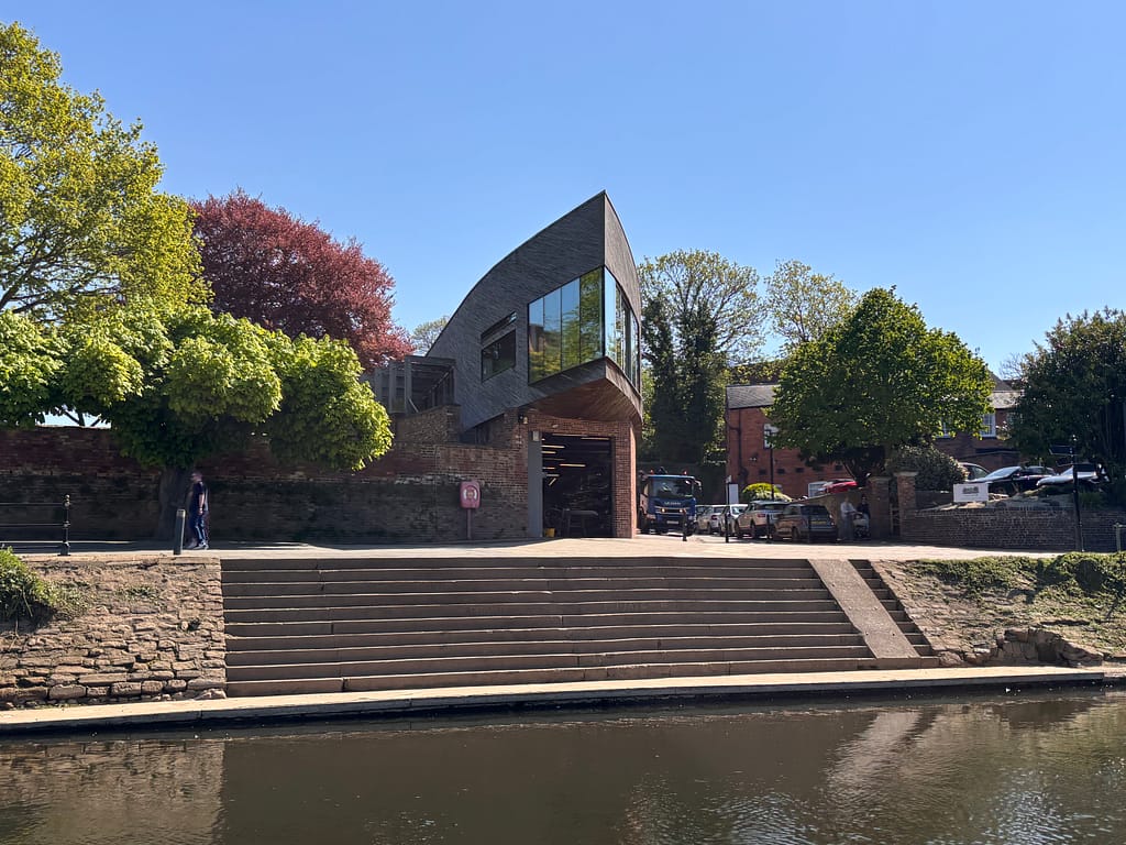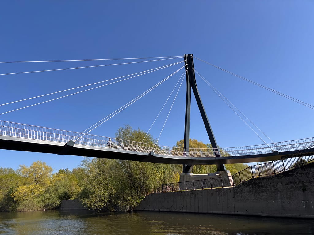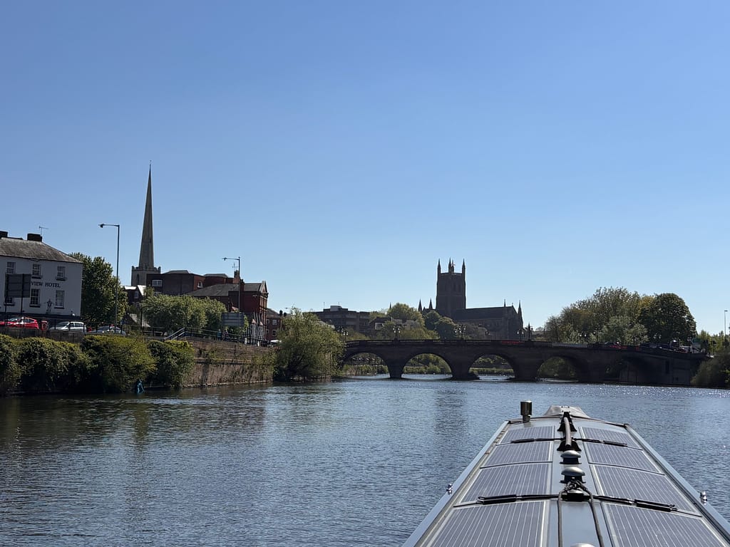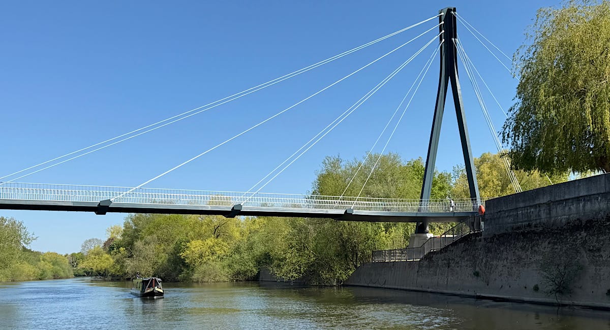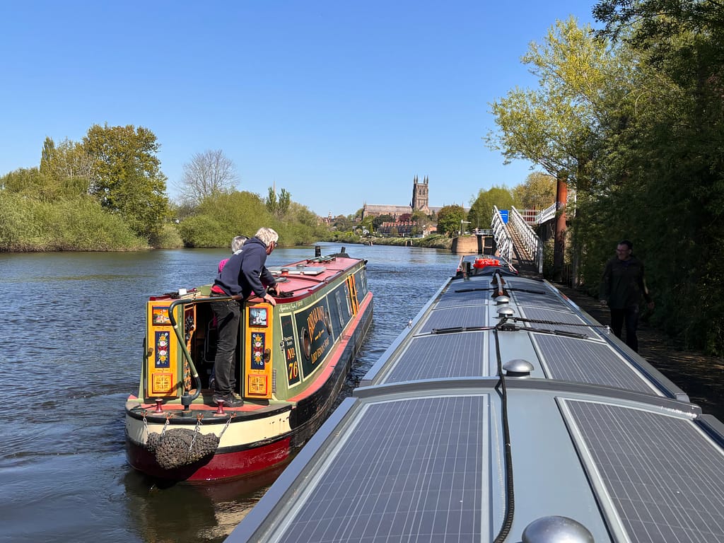 After our brief pause, we set off again on diesel propulsion and caught up with the Tidy’s who’d been going slowly. On the approach to Worcester there’s a fantastic bridge which I don’t remember seeing before. There’s a reason for that: it was opened in 2024, and we were last here in 2021! It’s the Kepax foot and cycle bridge, and has apparently been a big success.