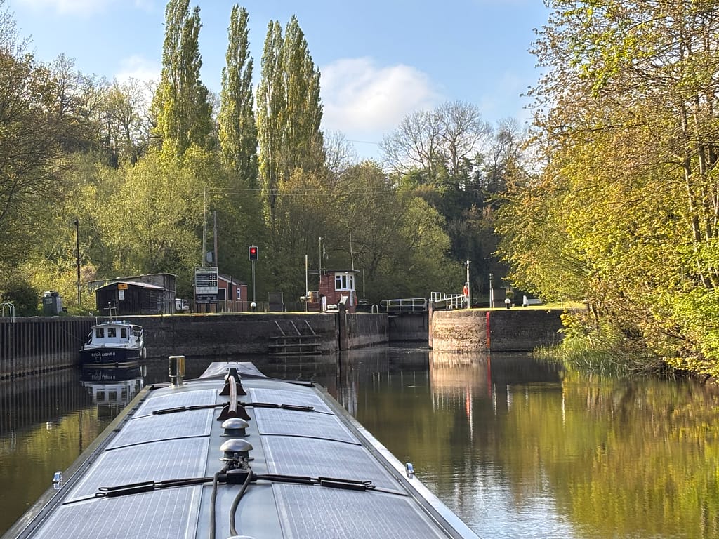 I did the first section on diesel propulsion, because I wanted to get an idea of how fast we were going. Being with the flow helps, so the GPS was saying we were somewhere between 4.7 and 5.3 mph. We very soon reached Lincomb Lock, KV’s first big river lock. As we approached the gates opened and the light turned to green.