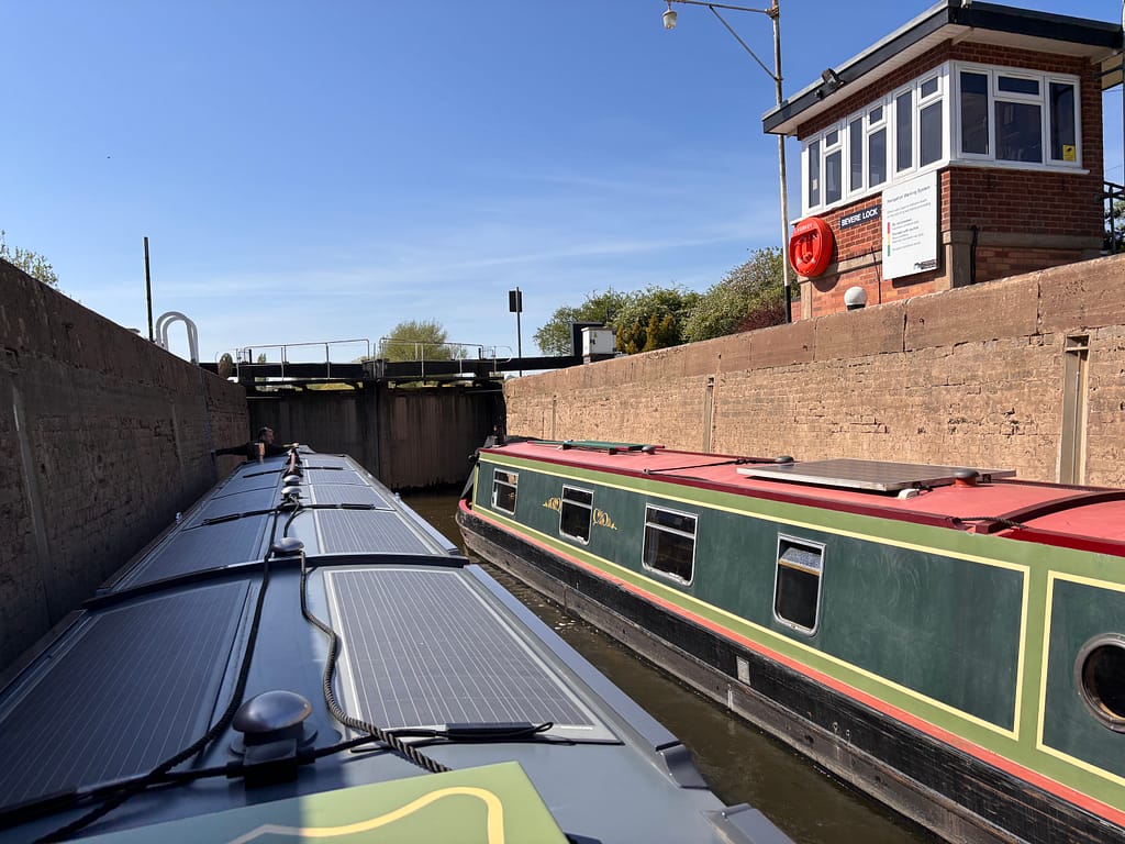 We pulled onto the pontoon hoping there’d be somewhere for Macc to go for a wee, but there’s no access from there, so we set off for Bevere Lock. Macc, incidentally, had started off asleep, then woke up and seemed to enjoy watching the countryside go by either from the stern or the locker in the well deck. Bevere Lock made three out of three where the gates opened as we approached and we could go straight in, this time with both boats.