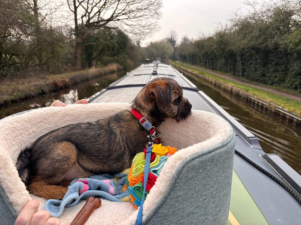 Macc had been out for a walk while we filled the water tank and then Adrian had been sitting with him on the well deck. We then tried him in his bed on the stern slide again, although he didn’t really settle.