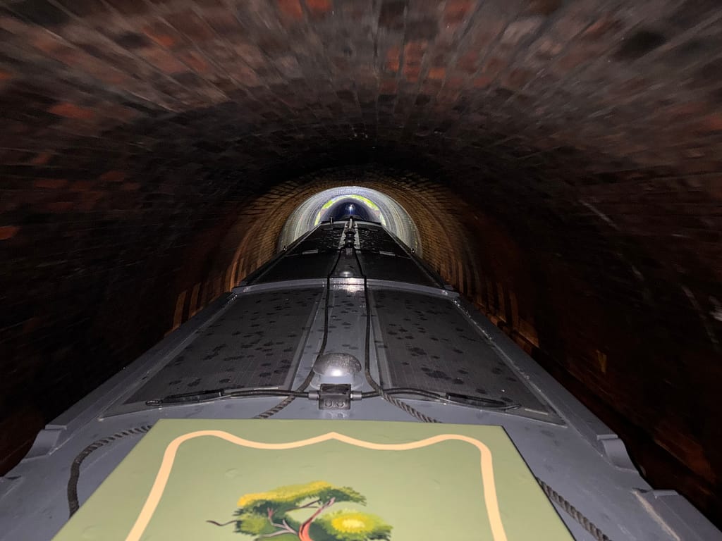As we approached the tunnel we could see a boat just going in. There’s was a tunnel keeper waiting to speak to us; he said we’d be able to go straight in, even though it was only a few minutes past 11, because a work which was operating today was currently out having a tea break. That explained why there was no 10am booking slot when I went online a few days ago. We had our safety briefing and then it was the tricky turn into the tunnel.