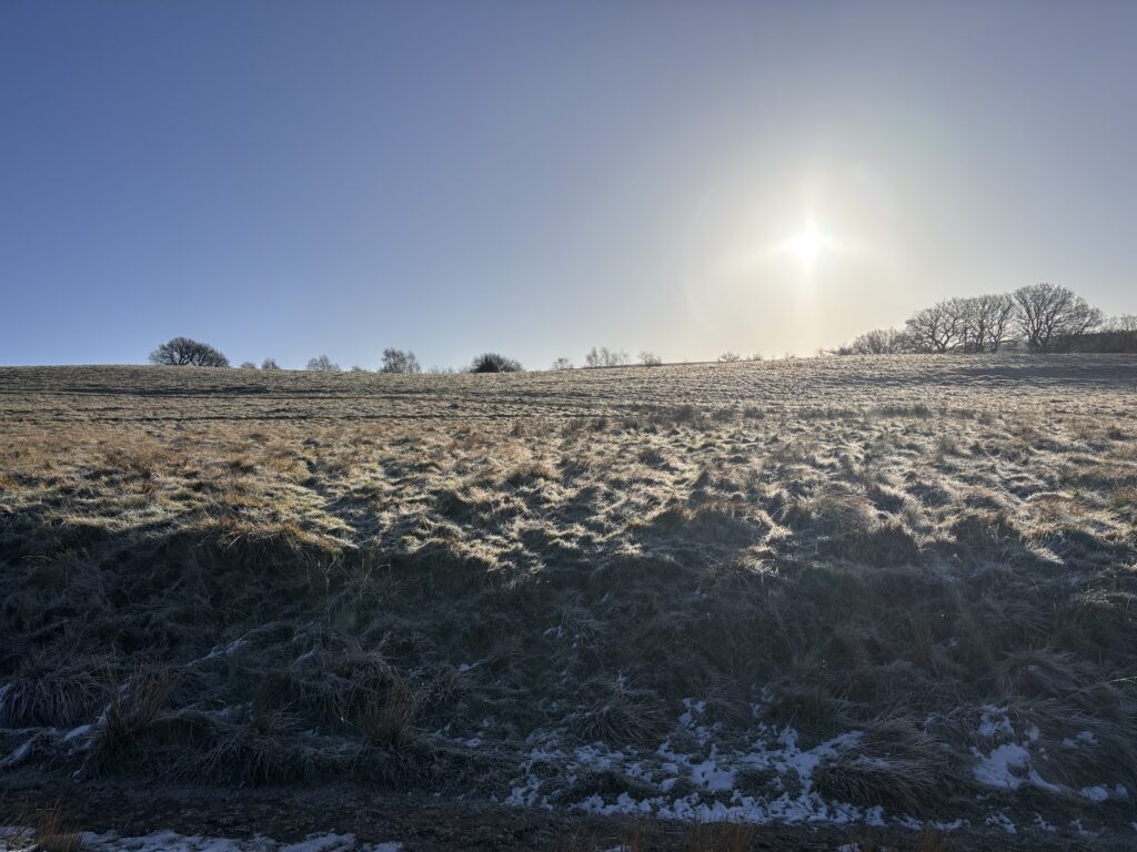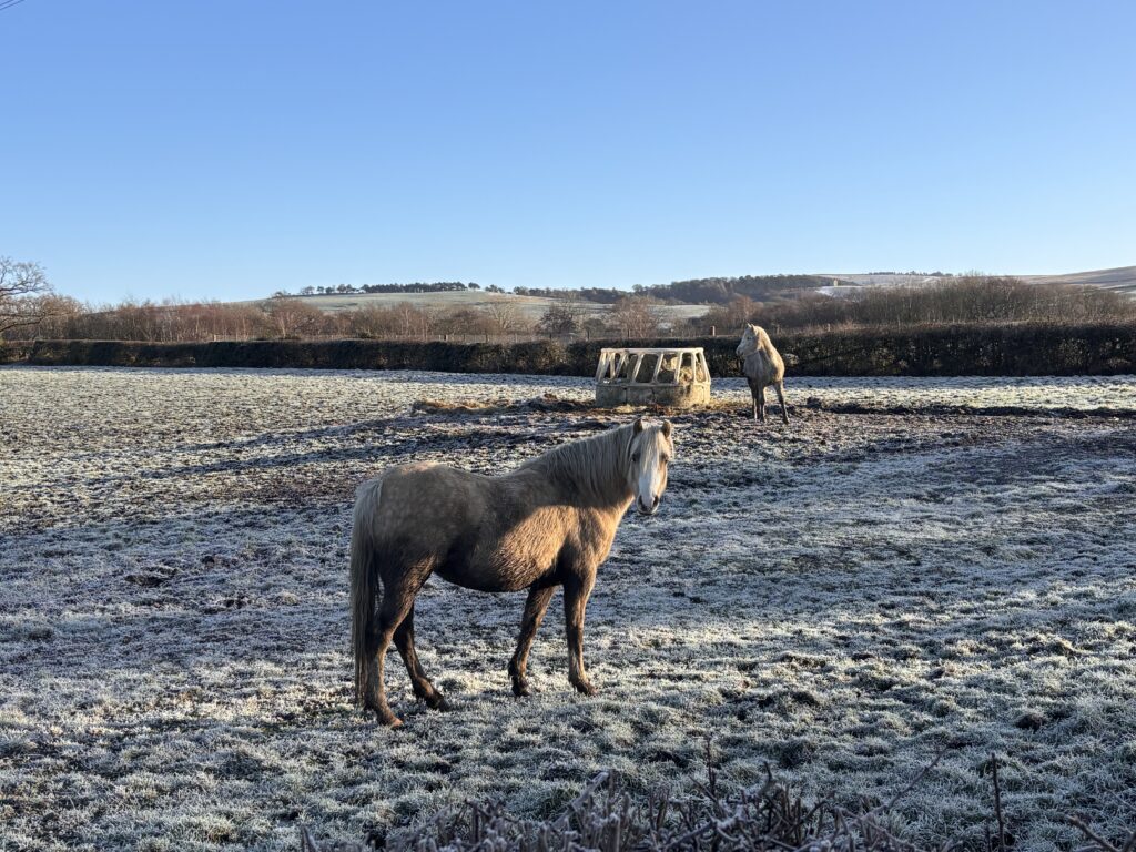A very heavy frost this morning, covering everything in white and freezing the bits of marina which had melted. It meant the boat was crunching in the ice again. But it was a lovely sunny day, so I thought I’d head uphill for my walk, because all the muddy fields would likely be frozen solid. So I turned left out of the marina and walked up the track past a couple of horses.