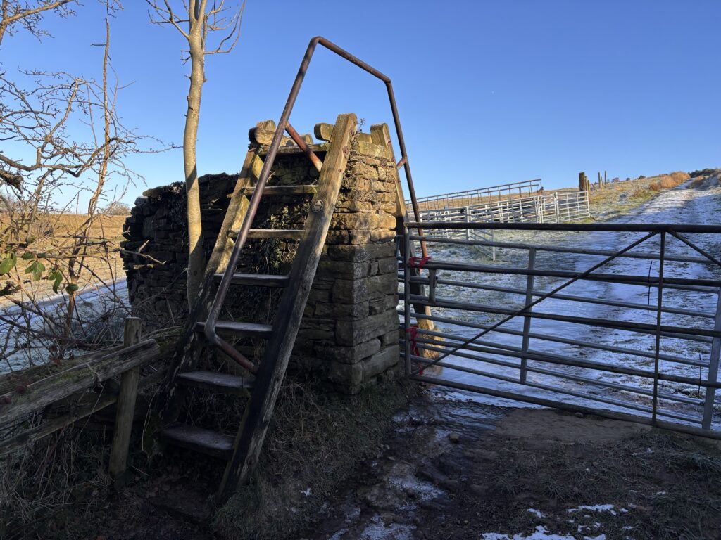I took the lane past the National Trust holiday let. A couple of days ago I stayed on the track, but today took the footpath that goes higher up the hill. To get onto it, there’s not so much a stile as a set of ladders. There was also solid ice at the bottom of the steps on both sides.