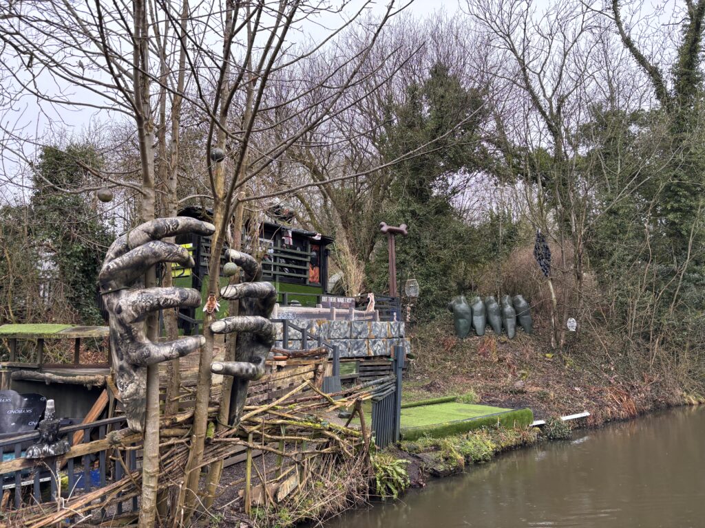 We knew we’d probably get wet today, but probably not as wet as tomorrow. So we followed our now normal puppy-based routine, and set off once Macc was sleepy and in his crate, about 9.30. The good thing at the moment is that there’s 60-90 minutes of awake and play time, and then there’s a couple of hours sleeping. The swing bridge was only a couple of bridges away, so Adrian went to open it. The little building there doesn’t only have the big hands sculpture, there are loads of different things.
