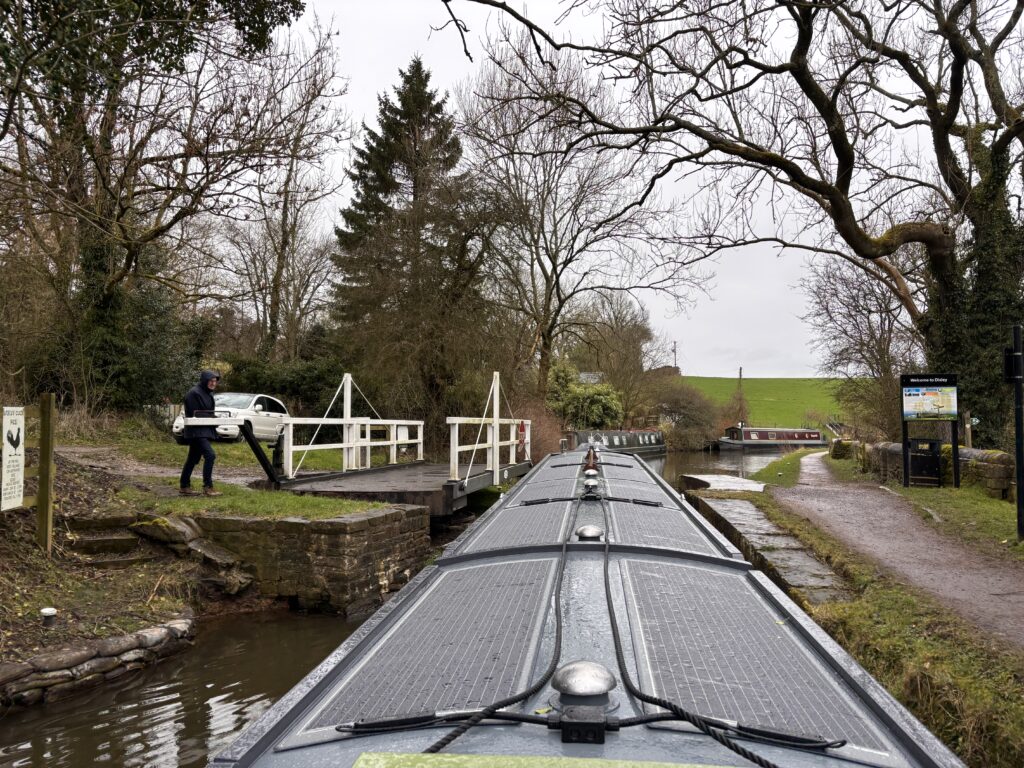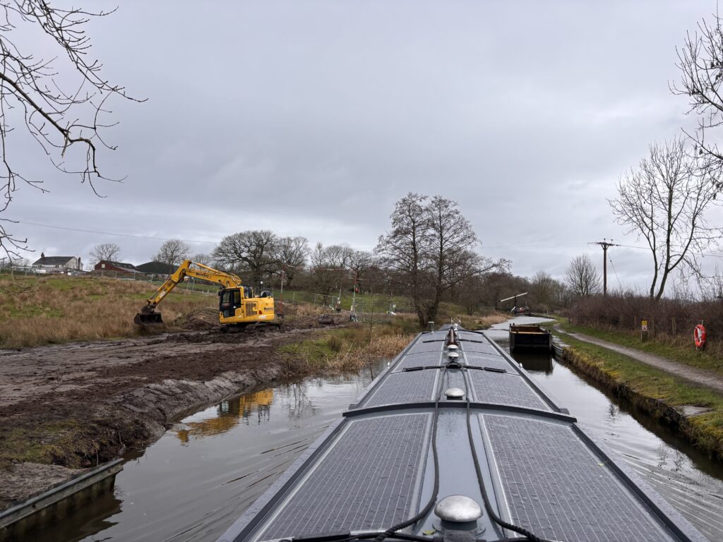 Adrian walked on to do the two lift bridges. There was activity today at the site of the winter works, which finished earlier this week. There was a digger making good on the offside. I hadn’t noticed yesterday quite how big the site was, with a rough road installed over a field to bring equipment to the canal.