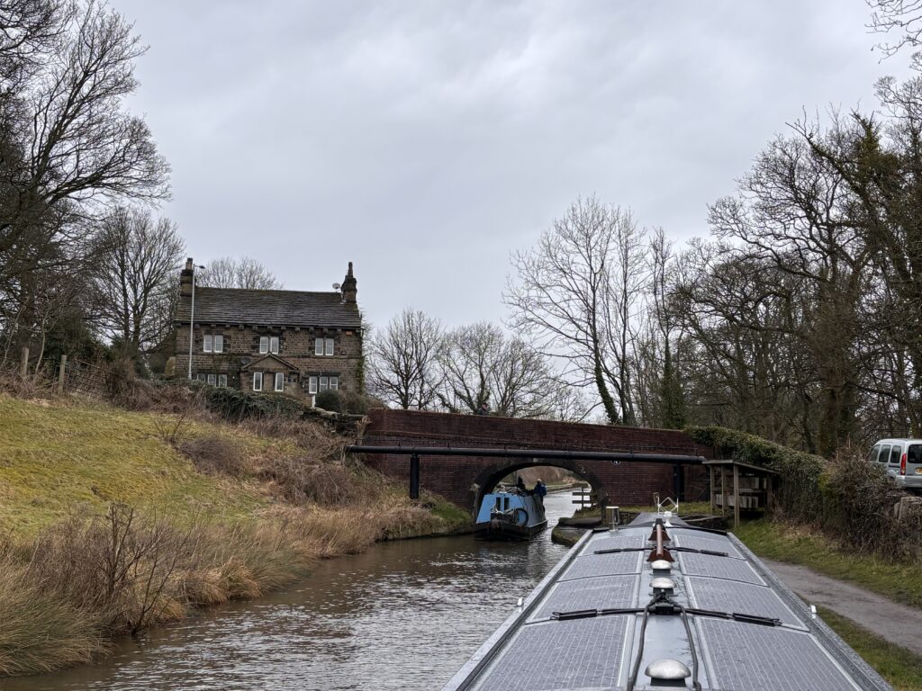 At Marple Junction we turned onto the Macclesfield Canal again, hoping for a decent mooring. There are more boats here than when we left yesterday; the space opposite the water point had gone, as had one immediately through Bridge 2. The spot we’d left yesterday was occupied, but there was one beyond it, so we went there. But the bow wouldn’t come in, it was stuck on something under the water. In the end we managed to get it off, and by moving back as close as we could to the boat behind, we got both ends close to the bank.