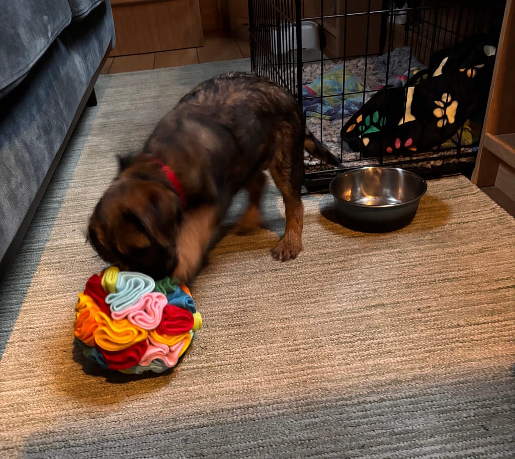 Macc has been getting very excited about his breakfast the past few days, so in order to slow him down and give him some mental stimulation he had half his kibble in a snuffle ball this morning. You hide the food in the folds and he has to find it, by rolling it about or giving it a shake.