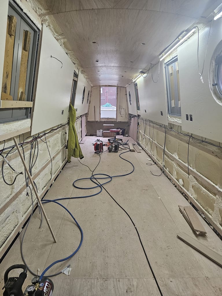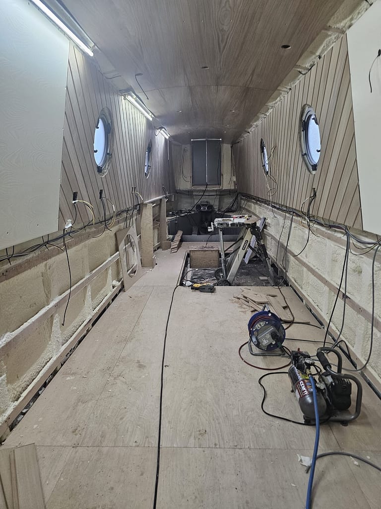 We were only up at Braidbar on Monday, but a lot seems to have happened since then. We’ve been sent the end-of-week photos, which show that we have ceilings, tongue and groove on the cabin sides at the back, and painted panels towards the bow.