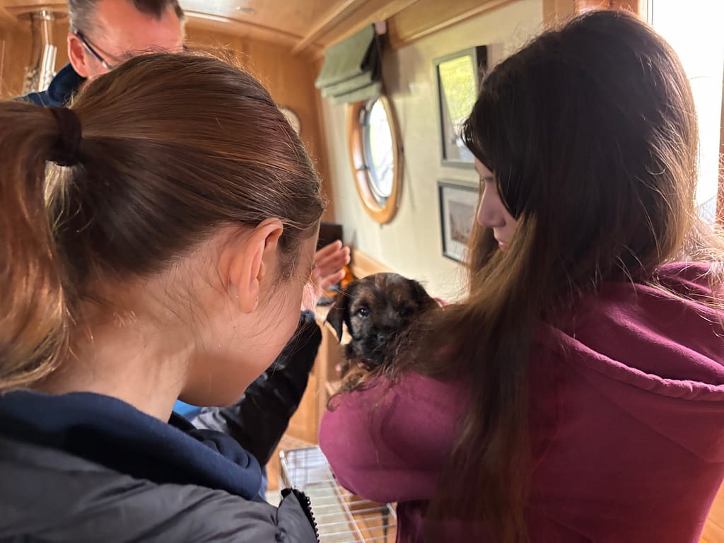 There was frost forming on the grass when I took Macc out at 5am, another new sensation for him. Later in the morning, my sister and my two nieces came to visit us. Well, they came to meet Macc really, although it was also their first time seeing the new boat. They have a new puppy themselves, Islay, a black lab, so they were fascinated by how tiny Macc was in comparison.
