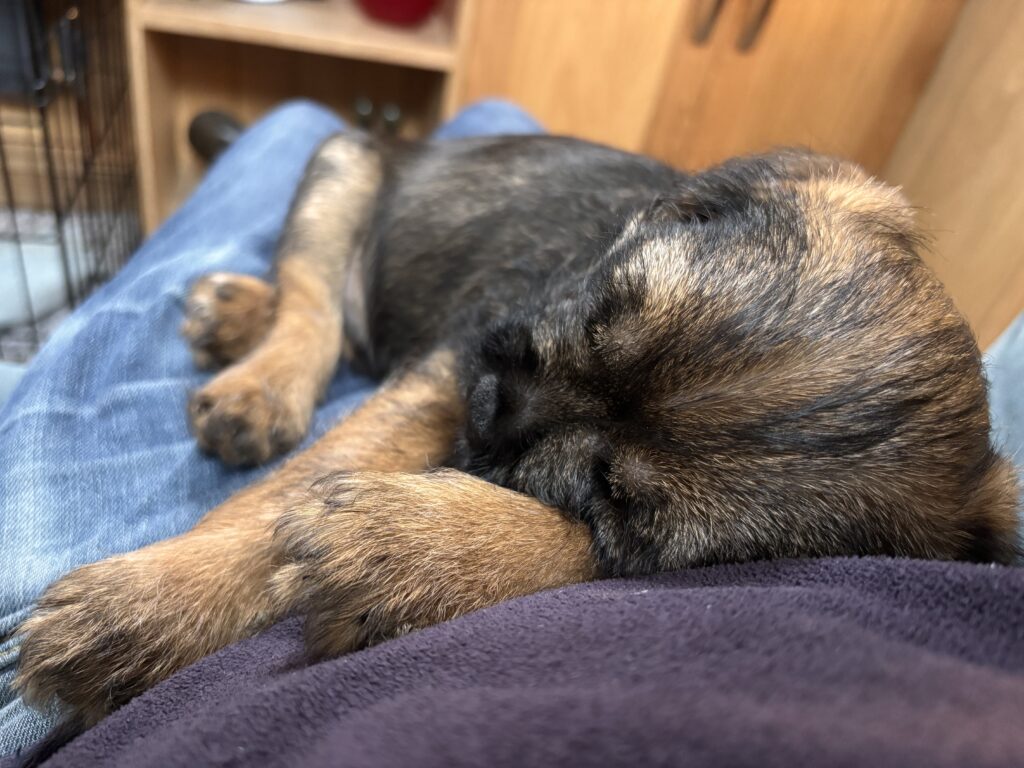 At about 6.30 Macc called us, so Adrian got up and took him out — and he needed to go, which was good. He then wolfed down his breakfast, having not eaten a great deal yesterday, and then settled on Adrian’s lap. We’ve alternated all day between an hour or so of boisterous play, then some calm play, and then sleep.
