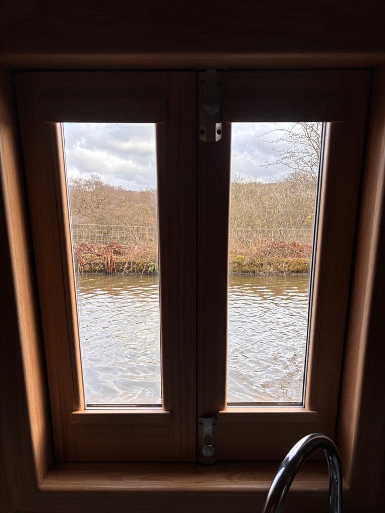 We had lunch, unplugged the shoreline (and amazingly managed to coil it tightly enough that it went back into its box), and reversed out of our space. We’d picked a moment when the wind had dropped a bit, and possibly because our neighbours were out we had a bit more room to swing round. I still ended up reversing up the Marin and then swinging out into the entrance, but it was all done without touching anything — even the turn left onto the canal against the wind. We’d initially thought we’d stop on the visitor moorings right opposite the marina, but boats had arrived during the morning so we thought we’d carry on. We did just a couple of bridges, mooring on some piling between bridges 19 and 20. It’s so nice to have a view from the galley.