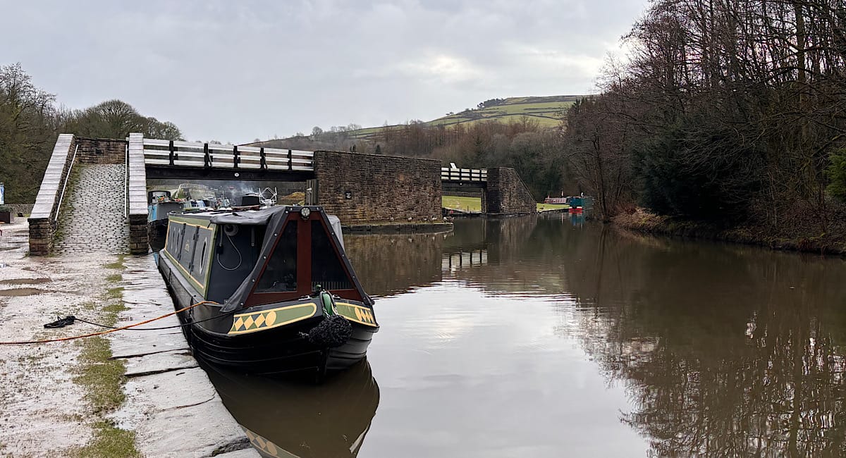 I went to do some shopping for a few days while Adrian stayed with Macc. When we were ready to set off again, it was only about a boat length to the junction — where we turned left towards Whaley Bridge. We did the arm just for completeness really; it’s lined with permanent moorings, has a busy road alongside, and there’s just a winding hole when you get to the end. Actually there’s also an old canal trans-shipment building which is worth a visit, which we had a look at on one of our Braidbar visits during the build.