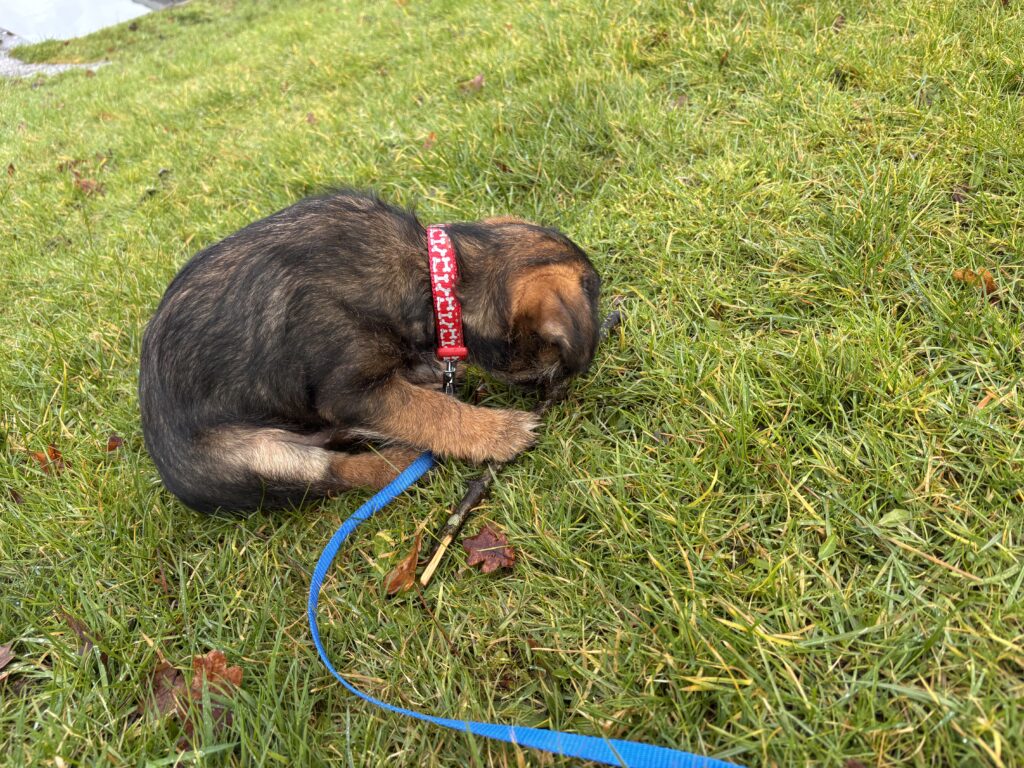 Adrian headed into Poynton to take some parcel returns to the post office, and also went to the pet shop for a new collar. The one he came with, which was colour coded for each puppy, was a quick release one and we needed something a bit more reliable. Macc enjoys his outings onto the grassy bank by the boat a bit too much, there are too many distractions. He likes pouncing on dead leaves, and he’s also found plenty of sticks, all of which get removed from him.