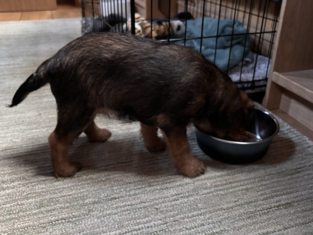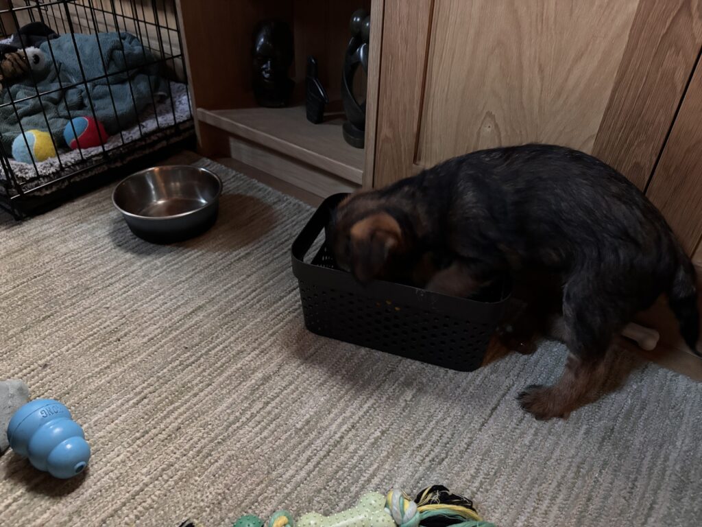 I took Macc out for his late night toilet break at about 11 last night, and he didn’t particularly want to go to bed. He went in his crate, I put the blanket over the top, and gradually turned the lights off. He whimpered for a little while but then settled. We were up at just before 5 to take him out again, and this time he really wanted to play when we were back inside. He cried for ten minutes or so, then must have realised he wasn’t getting anywhere so settled down to sleep again. Adrian took him out again a bit before 8, while I had a shower. Once back inside, he was confident enough to venture up the boat; I could hear him outside the bathroom door so opened it, and I think it must have been the first time he’d seen toes! He was very keen to have his breakfast too.