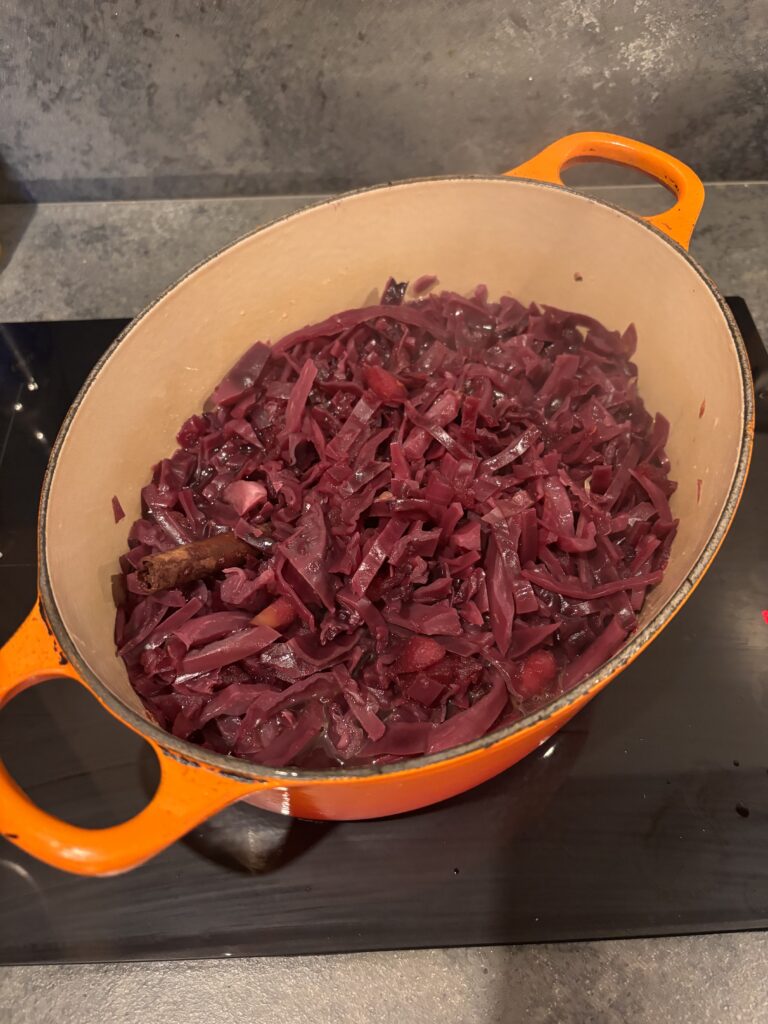 This afternoon, I’ve finally braised a red cabbage we bought for Christmas but hadn’t got round to doing anything with. I had to improvise on some of the ingredients and we also had some slightly elderly apples in the bowl, so they went in as well. There’s a huge amount, so there will be a couple of portions going in the freezer.