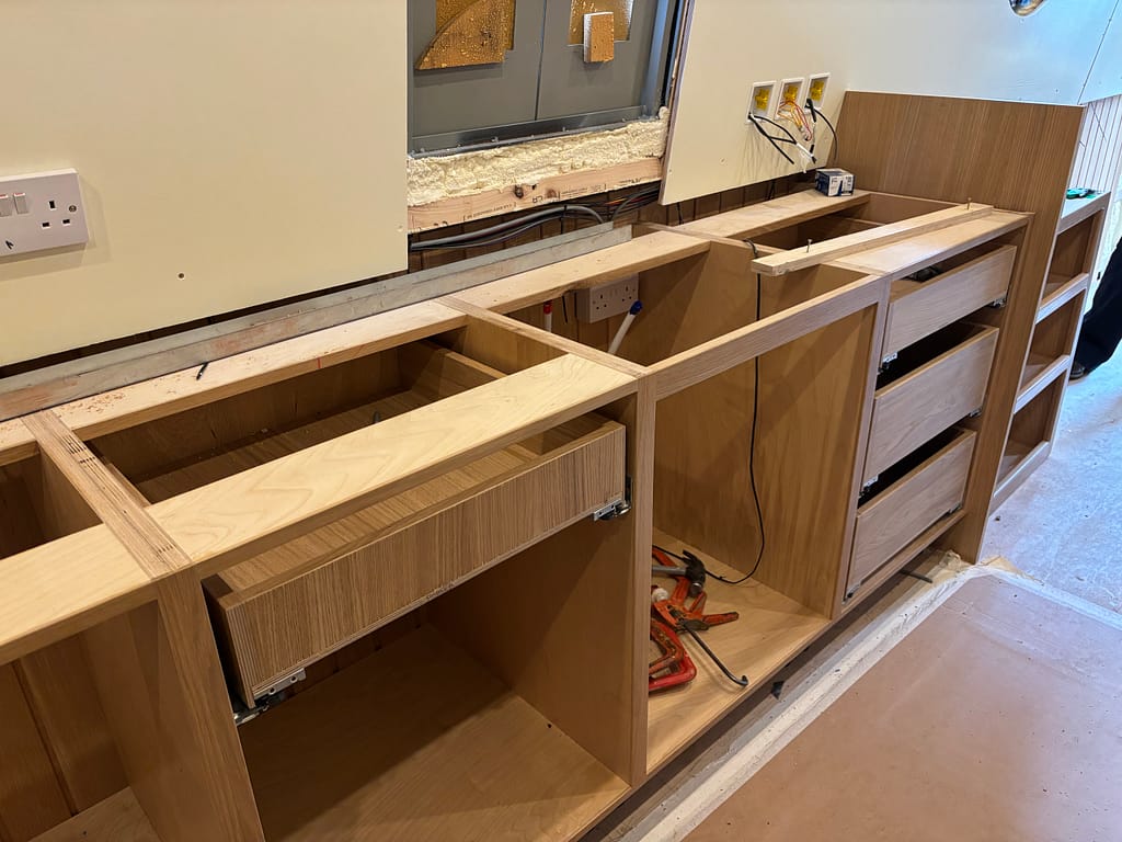 We’re told the floor will probably go in next week, and then the appliances can be fitted. This all assumes the boat stays fairly level, because if it’s at too much of an angle, it’ll be difficult to work in.