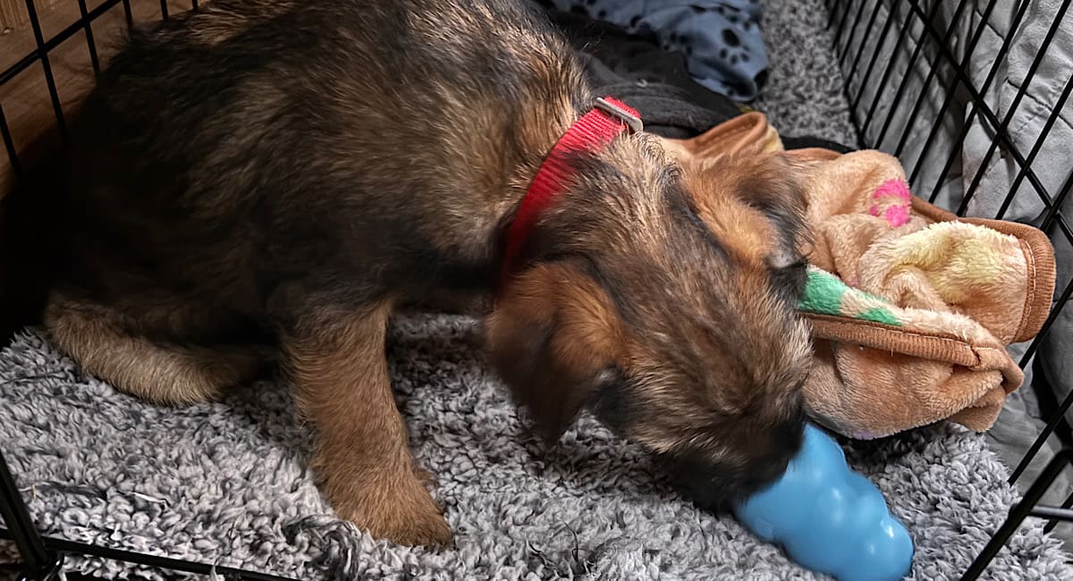 This afternoon we had our second session with Cal the puppy trainer. Apart from anything else, it’s good to be told that we’re essentially doing the right things. We also got some advice on calming Macc down, and ways to try to get him to sleep (because he’s a great one for propping his eyes open with matchsticks to make sure he’s not missing anything). We’ve also got a plan for another session next week, and a visit to a puppy class. Macc had already not had enough sleep today, and by the time Cal left he was exhausted; on her advice he went into his crate with a kong with some peanut butter in it, and before long he’d dropped off.