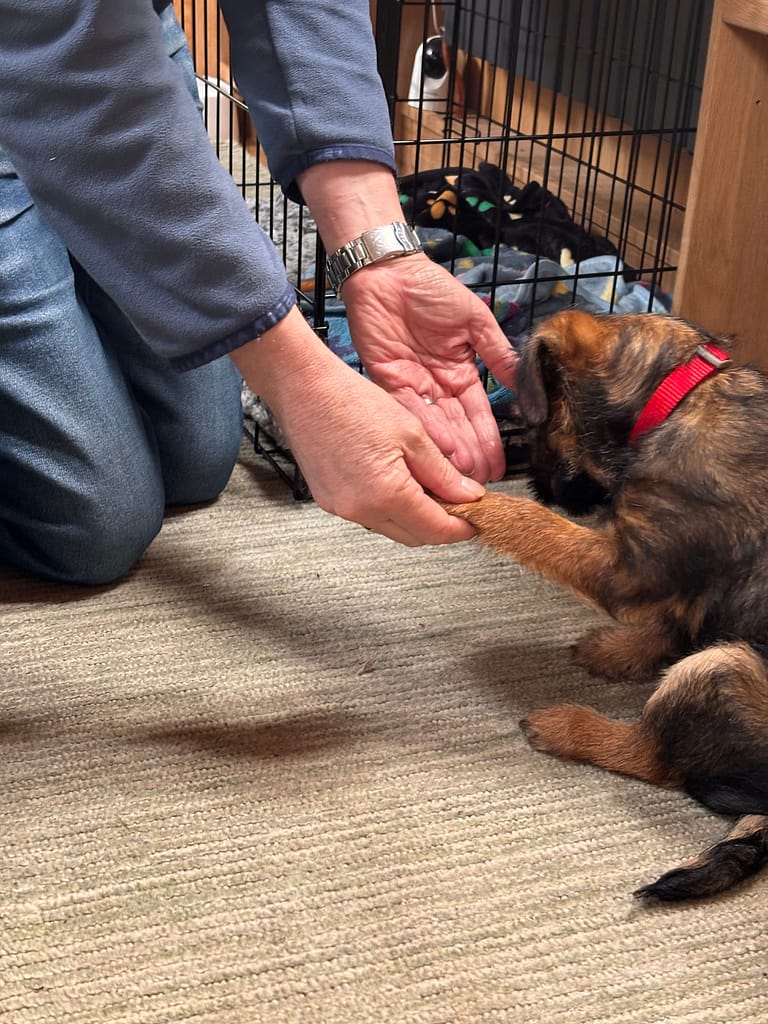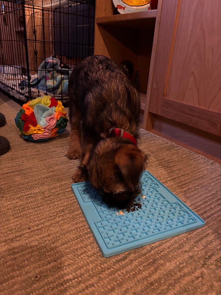 We have started a new routine with Macc today. For the first week we had him, we took him out for a loo break at 11pm, and then got up to take him out again at 5am; he’d then go back to sleep until gone 7.30. As he was normally still asleep at 5, last week we started moving the event a bit later. The trouble was that if we got him up at 6, he would then be wide awake and wouldn’t go back to sleep again. So today we both got up at 6.30, took him out, and gave him his breakfast about 7. Then by the time we’d each been for a shower and were ready for our breakfast, he was sleepy enough to go for the first nap of the day. Macc tried the licki mat for the first time at breakfast time, with some banana and blueberry pushed into it. It seemed to be a success.
