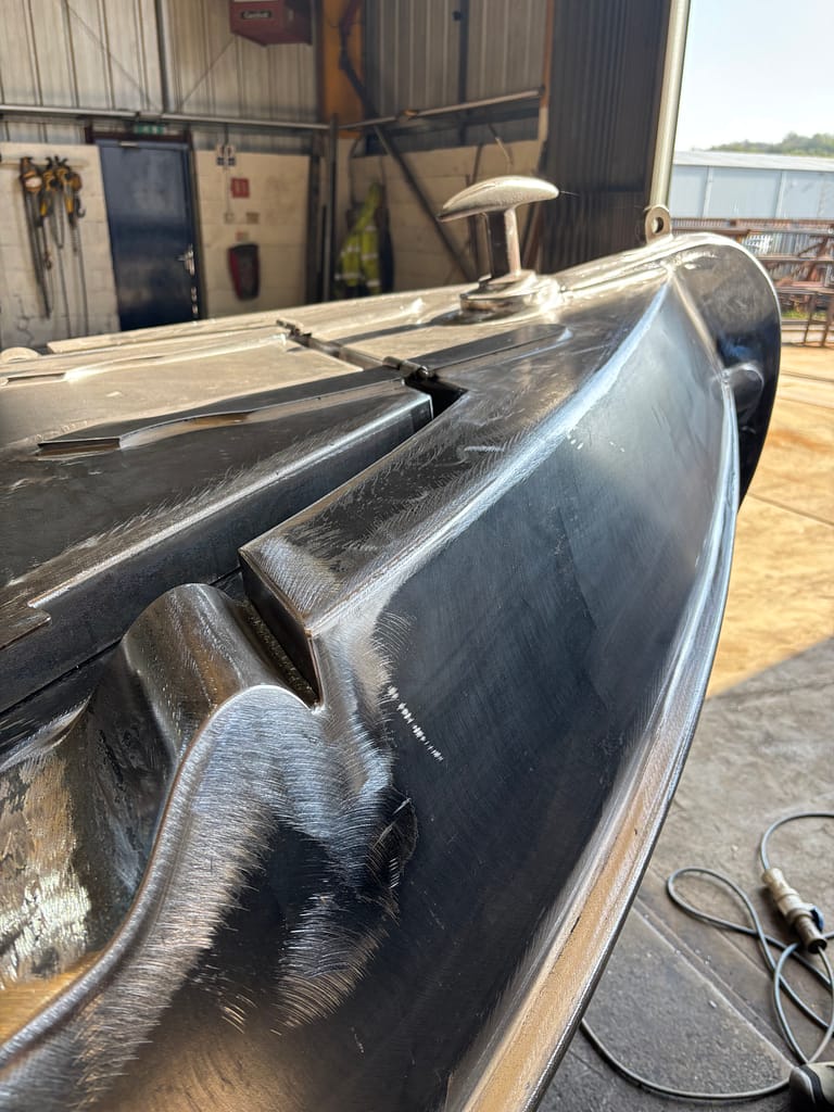 We’ve made another visit to Tim Tyler’s workshop, to see the finished Kingley Vale. Tim contacted us yesterday to say they’d be starting to paint the boat today, so if we wanted to see it in bare metal, this morning was the time to go. She looks fantastic!