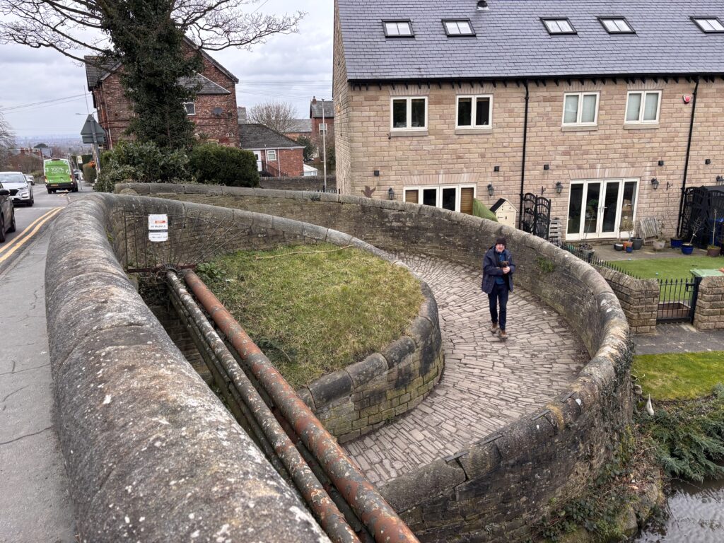 There were a few spaces at Marple and we decided to stop before Bridge 2, as it was difficult to see if there was space beyond, opposite the water point. Macc had his lunch and then we put him in his new sling to walk down to the vet. Perhaps not surprisingly he got a lot of comments on the way.
