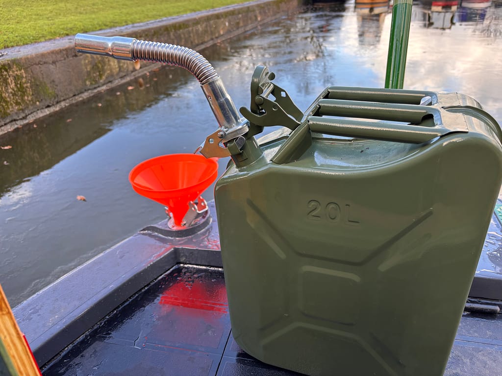 By the time I got back to the boat there were four cans of diesel lined up on the pontoon, even though it was still morning! So I set about taking each one through the boat and emptying them into the tank. Fortunately our can came with a bendy spout, and we also got a big funnel that fits nicely in the filler. Still, each can is quite heavy to lift and pour from, and each takes a while to empty.