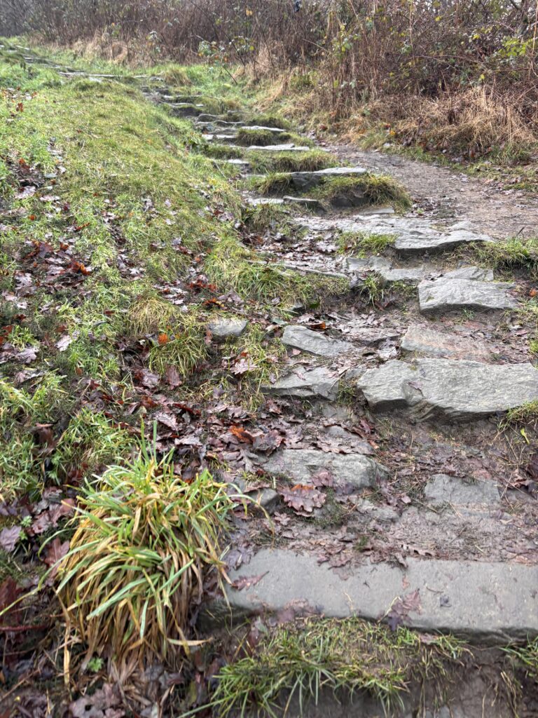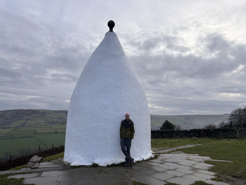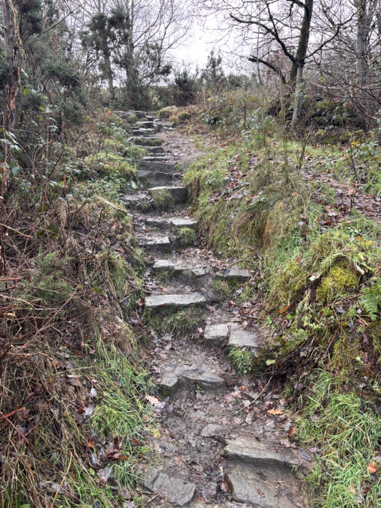 A much better day today, although it would have been difficult to be worse! After breakfast we headed out to walk up the hill to White Nancy, a folly on the top of Kerridge Hill which was built in 1817 to commemorate the Battle of Waterloo. We went along the towpath to the next bridge, crossed it, and took a path up to the village of Kerridge and then following the signs up the hill. The final stretch is up a characterful stone staircase, which seems to go on and on.