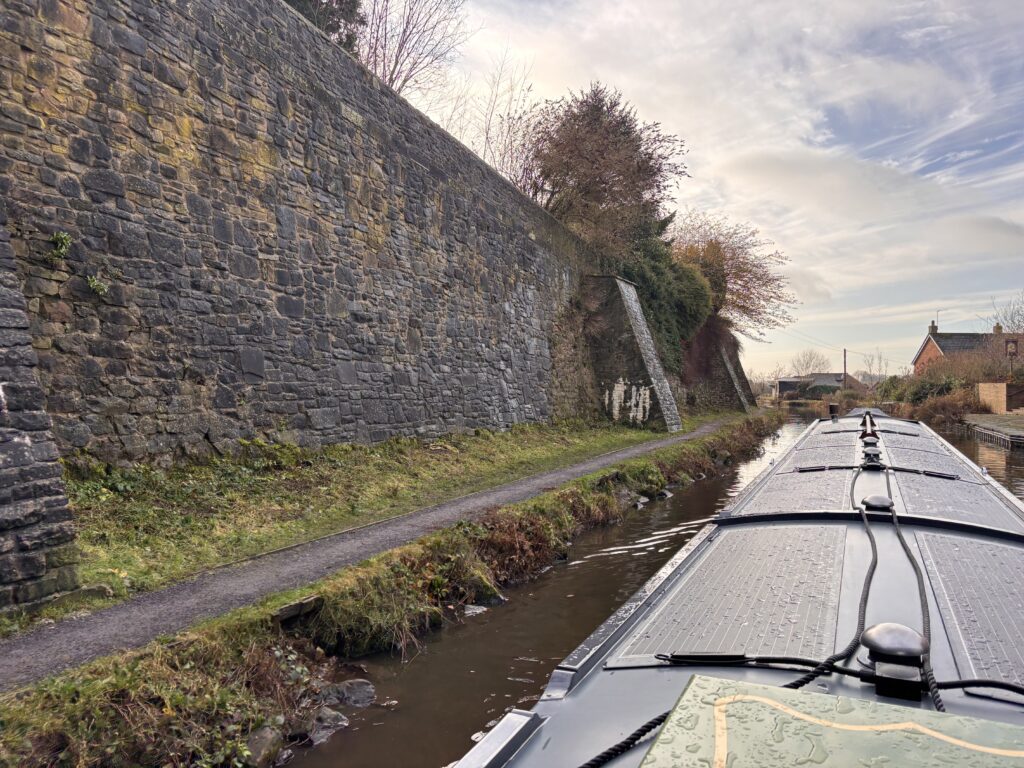 We pulled in at the water point and started filling the tap. The pressure was terrible and it was taking ages, so we had lunch, then gave up. We can try one of the taps at Bosley tomorrow instead. The next section of canal has a massive wall with buttresses along the towpath.