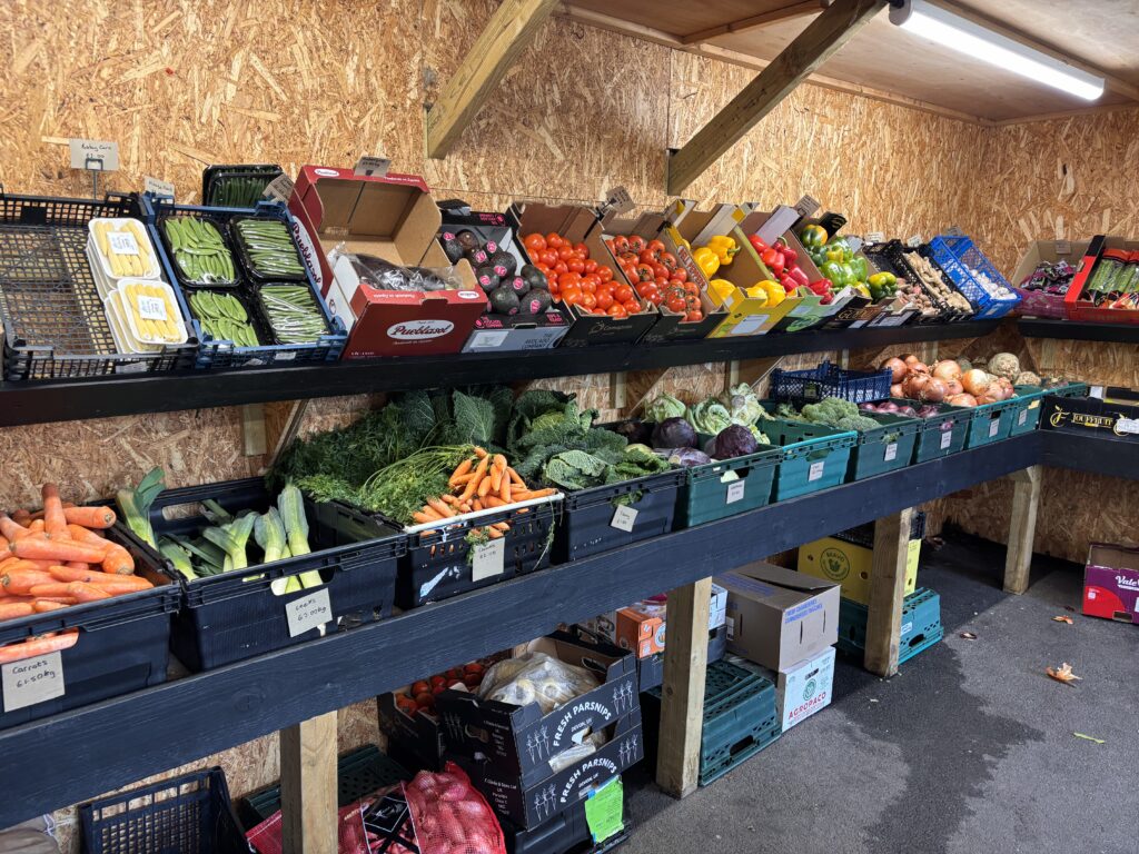 We went to find a post box, then visited the big garden centre that’s alongside the canal. They didn’t sell stamps, but the lady on the till suggested the Post Office in Sutton, so we walked up the lane, across a field, and into Sutton Lane End, where the Post Office is in a village store which has a cafe and a florist, and a remarkable green grocery section in a unit outside.